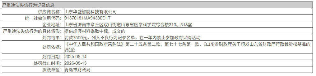 近日,军队采购网信息显示,山东华盛智能科技有限公司因提供虚假材料谋取中标、成交,被青岛市财政局罚款7500元,列入不良行为记录名单,在一年内禁止参加政府采购活动。