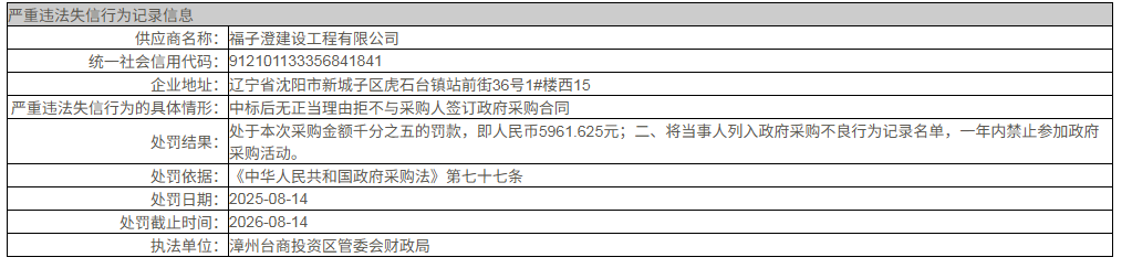 近日,军队采购网信息显示,福子澄建设工程有限公司因中标后无正当理由拒不与采购人签订政府采购合同,被漳州台商投资区管委会财政局处于本次采购金额千分之五的罚款,即人民币5961.625元;并将当事人列入政府采购不良行为记录名单,一年内禁止参加政府采购活动。