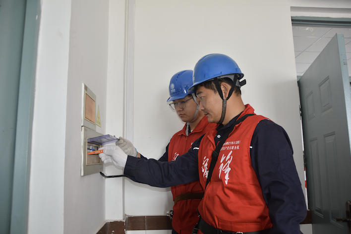 9月1日,国网沈阳市沈北新区供电公司员工董浩、周子琪在清水台学校对开关等设施开展安全检查。石阳/摄