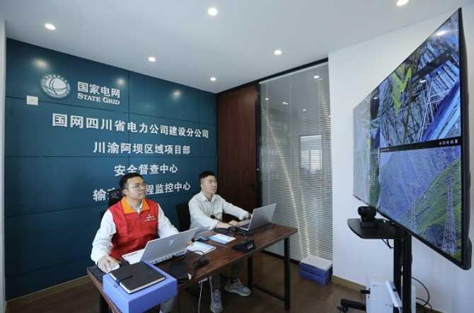同一天,在阿坝—成都东1000千伏特高压交流工程的铁塔组立现场,国网四川建设公司党员突击队队员王伟通过天网监控系统,远程实时监护高空作业人员完成一整基铁塔的组立任务。