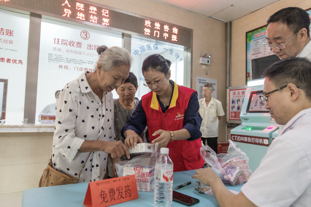 8月27日,志愿者在湖北省宜昌市秭归县中医医院协助医生免费发放对症药品。梅雪飞/摄