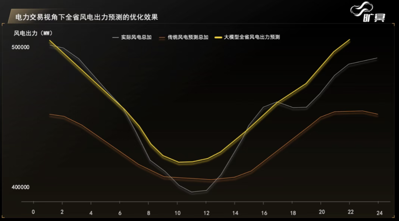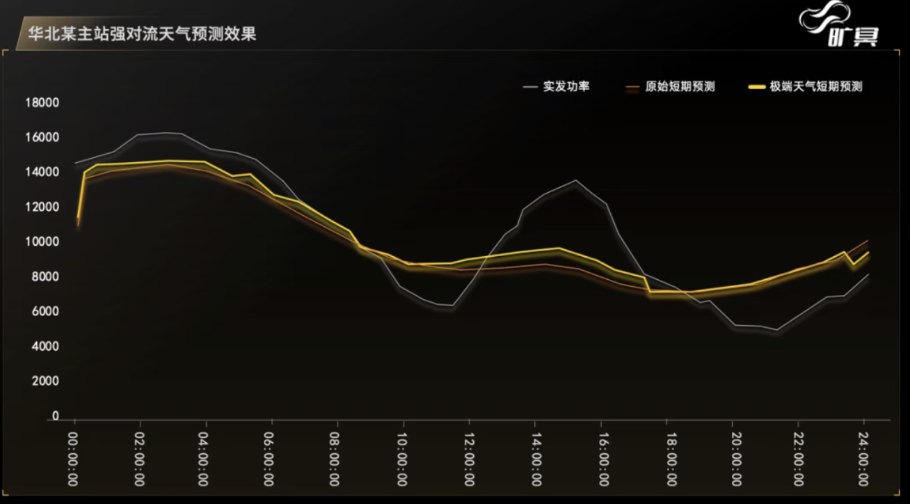 此外,在华北运营的新能源电站面对强对流天气过程中,「旷冥」3.0极端天气模型敏锐捕捉局地突发对流信号,并在传统模型尚未反应前完成预测路径的动态修正,使整体RMSE降低1.37%,显著提升了单点电站的安全边界,更为电网主站提供了全区域风电功率预测、跨场站调度优化与实时风控的能力,使调度者能够在出力骤降与备用启停之间提前识别风险区间、优化资源配置。
