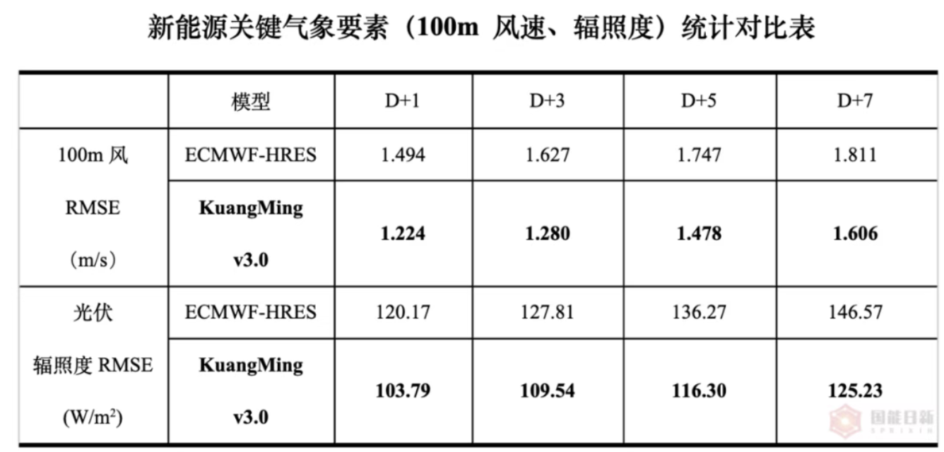 传统AI气象预测模型以10米风速、2米气温等传统标准气象要素为核心输出,难以完全满足新能源业务需求。「旷冥」3.0以新能源应用为导向,专门训练和输出100米风速和风向以及地面光伏辐照度等气象要素,并且误差明显低于ECMWF-HRES,真正做到了从气象预测到新能源发电预测的无缝衔接。