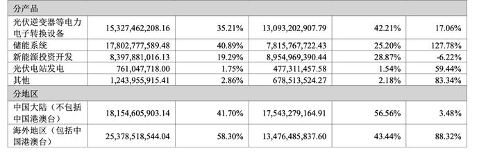 半年报显示,阳光电源光伏逆变器等电力电子转换设备业务营收153.27亿元,同比增长17.06%,占总营收比重约35.21%;储能系统营收达178.03亿元,同比增长127.78%,占总营收比重约40.89%。