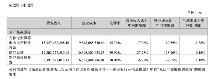 除了两大营收主力,阳光电源的新能源投资开发营收达到83.98亿元,毛利率上涨1.18个百分点,达到18.06%。