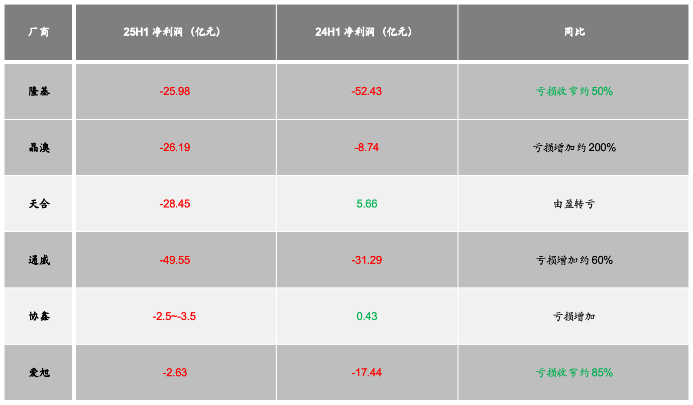 2025年上半年隆基绿能净利润为-25.98亿元,较去年同期亏损收窄约50%;其中二季度净利润-11.62亿元,较一季度继续改善。更为亮眼的是,公司经营性现金流明显改善,从去年同期的-64.13亿元大幅提升至-4.84亿元。爱旭股份表现更加突出,2025年上半年净利润-2.63亿元,较去年同期亏损收窄约85%,且在二季度单季实现扭亏为盈,净利润达0.37亿元。公司上半年营业收入84.46亿元,同比增长63.63%,经营活动产生的现金流量净额达到18.55亿元,相比去年同期的-32.93亿元实现根本性改善。