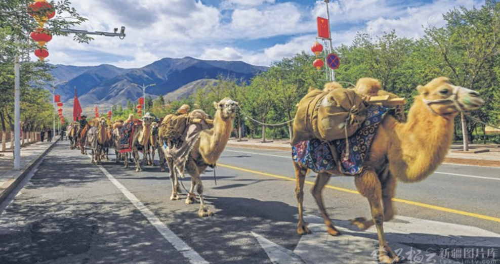 8月22日,骆驼队在巴里坤哈萨克自治县街道上行走。