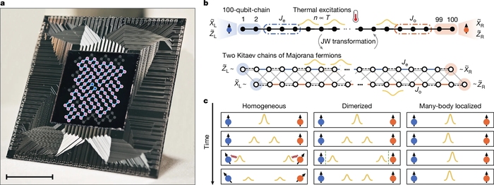 研究团队在“天目2号”量子芯片上搭了100个粒子的长链,对这些粒子之间的耦合强度进行了二聚化设计。实验显示,即便长链里有大量热激发,两端拓扑边缘态寿命仍和零温时相近,这意味着实现了一种前所未有的新型“热”拓扑边缘态。