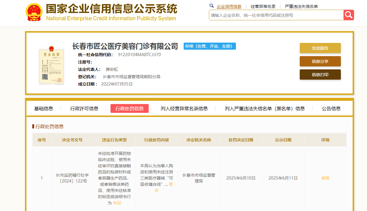 6月10日,长春市市场监管局对匠公医美门诊下达《行政处罚决定书》,并依法通过国家企业信用信息系统向社会公示。长春市市场监管局公示的长市监药稽行处字〔2024〕122号《行政处罚决定书》显示,长春市匠公医疗美容门诊有限公司因使用未经注册的医疗器械与药品而被处罚。
