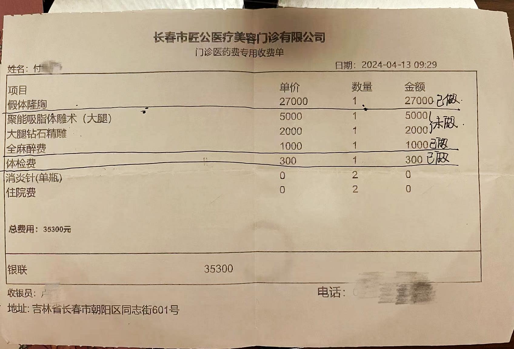 8月18日上午,付女士向记者讲述了她与匠公医美门诊发生医美纠纷的经过。2024年4月,经人介绍,她交纳3.53万元在匠公医美门诊做假体隆胸、聚能吸脂体雕术(大腿)、大腿钻石精雕项目。同年4月13日、11月20日,该门诊对其进行了上述手术。术后,付女士出现胸部高低不一致、两腿外侧明显出坑、眼沟不正确凸起的情况。付女士认为医美手术存在问题,与匠公医美门诊交涉,要求退还费用并对出现问题的胸部、泪沟、双腿进行修复治疗。匠公医美门诊认为手术不存在问题,拒绝了付女士的要求。付女士分别向长春市市场监管局朝阳分局永昌市场监管所、长春市朝阳区卫生健康局医政处进行了投诉。