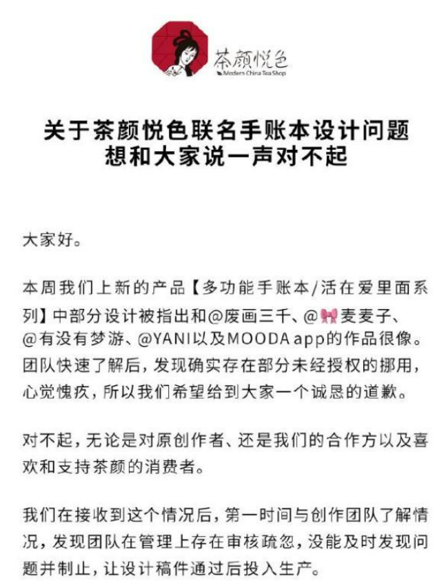 8月24日,茶颜悦色官方微博就联名手账本设计问题致歉。茶颜悦色表示,团队快速了解后,发现确实存在部分未经授权的挪用,并称团队在管理上存在审核疏忽,没能及时发现问题并制止,让设计稿件通过后投入生产。