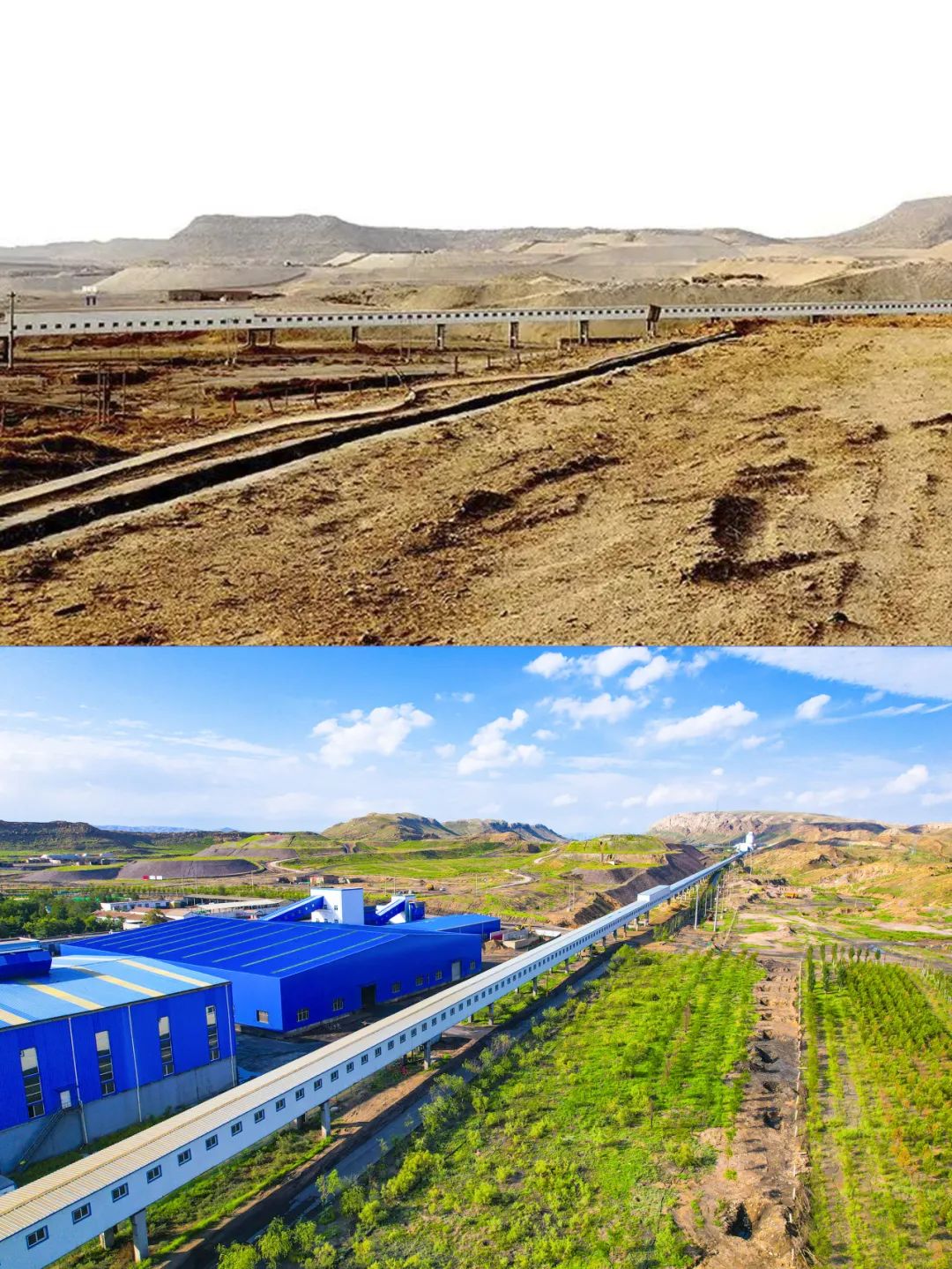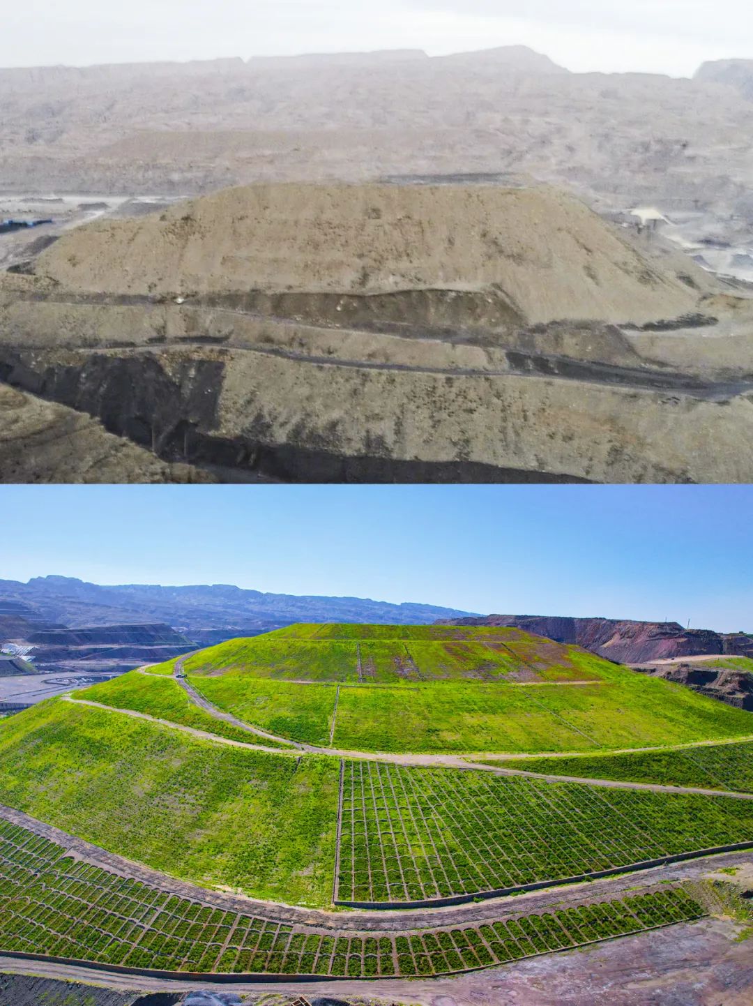平沟煤矿矸石扎堆治理前裸露荒坡,经草木改良土壤、施肥喷淋,25万平方米披绿化,生态蜕变,焕然一新。
