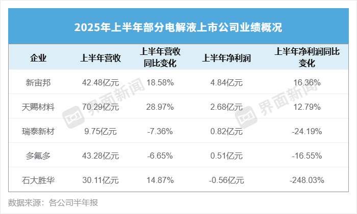 据界面新闻不完全统计,截至8月26日,已披露上半年业绩报告的五家电解液企业中,两家净利增长,三家净利润下滑,其中一家陷入亏损。
