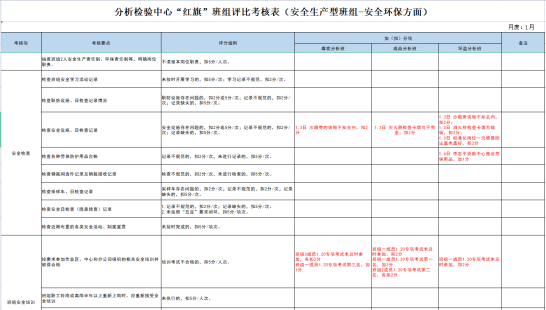 围绕“党建引领型、安全生产型、教育培训型、标准管理型、民主和谐型”五个方面制定考评办法,设置“五型”专业指标基础分值、评比否决条款,采用“月检查、季授旗、年表彰”模式,对15个班组进行交叉检查、综合考评。