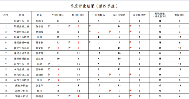 每月初召开讲评会,总结上月评比结果;每季度召开“五型”班组创建总结会,表彰授予“季度流动红旗”;每年召开班组长座谈会,分享班组管理经验,且对评比过程中展现的好做法、好效果进行总结推广。考评小组根据15个班组的流动红旗获取次数(12面),确定1个年度“星级”班组,被评为“星级”班组的单位,第一年认定为“四星级班组”,如次年仍被评为“星级”班组,可由“四星级班组”升至“五星级班组”,作为向分公司推荐先进集体班组、十佳班组的重要参考依据。