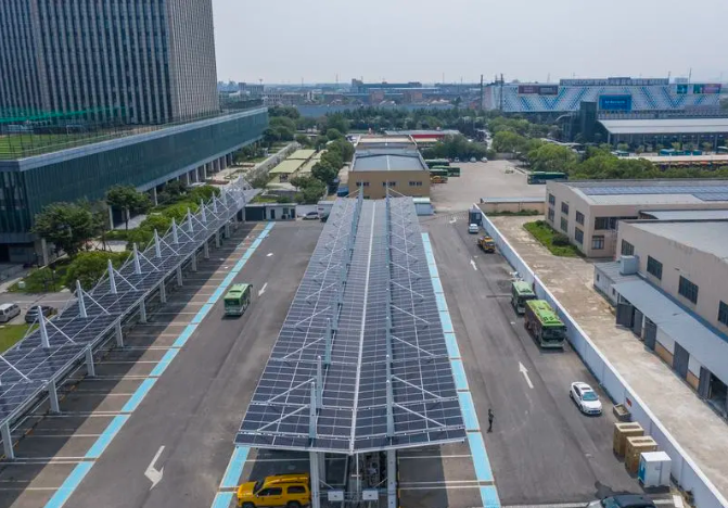 5月27日拍摄的湖州长兴公交总站光储充一体化公交充电站(无人机照片)。 新华社