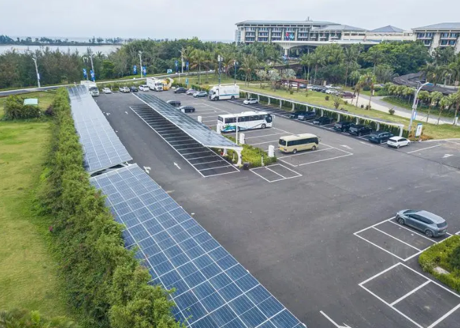 2025年3月16日在海南博鳌零碳示范区拍摄的建有光伏发电设备的停车场(无人机照片)。 新华社