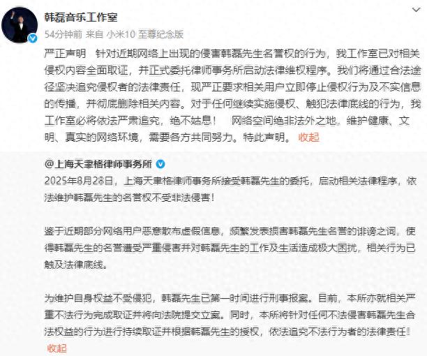 针对近期网络上出现的侵害韩磊先生名誉权的行为,我工作室已对相关侵权内容全面取证,并正式委托律师事务所启动法律维权程序。我们将通过合法途径坚决追究侵权者的法律责任,现严正要求相关用户立即停止侵权行为及不实信息的传播,并彻底删除相关内容。对于任何继续实施侵权、触犯法律底线的行为,我工作室必将依法严肃追究,绝不姑息!