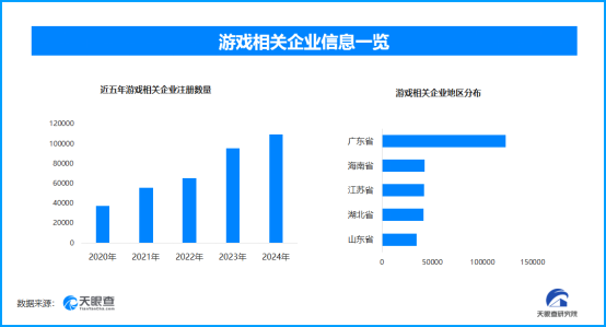 天眼查专业版数据显示,截至目前我国现存在业、存续状态的游戏相关企业超62.6万家。其中,2025年截至目前新增注册相关企业约10.3万余家,从企业注册数量趋势来看,近五年间,游戏相关企业的注册数量呈现出逐年增长的态势,并在2024年达到顶峰。