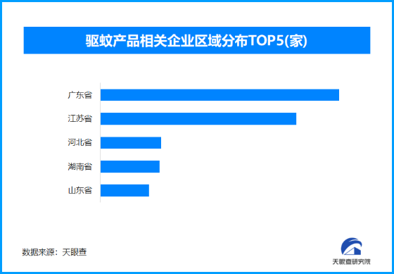 天眼查专业版数据显示,截至目前我国现存在业、存续状态的驱蚊产品相关企业超9700余家。从区域分布来看,广东省、江苏省驱蚊产品相关企业数量位居前列,两个省市数量总和超过4900家,占企业总数的50.7%。