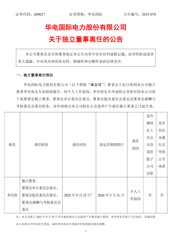 华电国际9月5日发布公告称,公司董事会于近日收到本公司独立董事李兴春先生的辞职报告。因个人工作原因,李兴春先生申请辞去其担任的本公司第十届董事会独立董事、董事会审计委员会委员、董事会提名委员会委员及董事会薪酬与考核委员会委员职务,该申请将自本公司股东大会选举产生新任独立董事之日起生效。