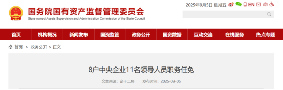 国务院国资委网站9月5日消息,8户中央企业11名领导人员职务任免。其中,武岳彪任中国煤炭地质总局副局长;免去王斌的中国电力建设集团有限公司党委副书记、党委常委、董事职务,不再担任中国电力建设集团有限公司总经理职务,退休;聘任章克勤为中国煤炭科工集团有限公司外部董事;聘任李辉、陈建华为中国航空油料集团有限公司外部董事。