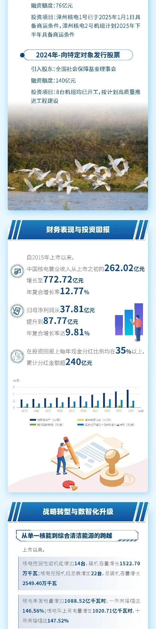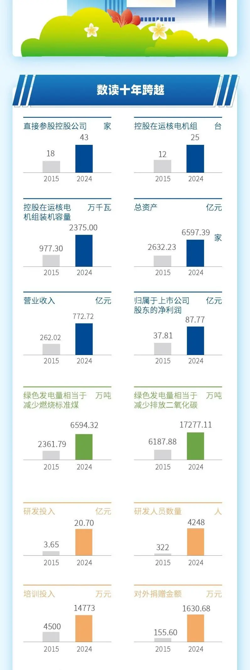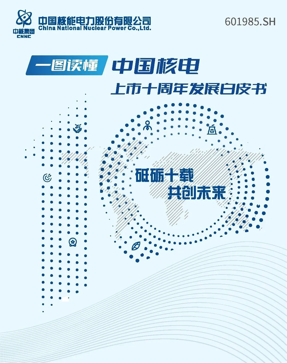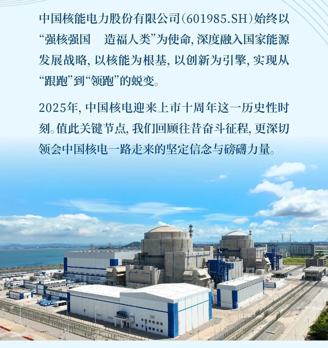 2015年6月10日,中国核电以代码“601985”铭刻核工业历史与初心、登陆A股市场以来,始终秉持“强核强国、造福人类”的企业使命,积极践行国家绿色低碳发展战略,实现了从单一核电运营向“核能+非核清洁能源+战略新兴产业”多元布局的战略转型,完成了从跟跑、并跑到局部领跑的历史性跨越。十年间,中国核电装机规模实现跨越式增长,在运、在建核电机组数量显著提升,非核清洁能源装机突破3000万千瓦。2024年,公司旗下25台运行机组全部达到“WANO卓越行动计划2030”绩效目标,成为全球首批全部运行机组达标的企业;三门核电获评全球核电行业首个“灯塔工厂”;“玲龙一号”小堆示范工程开工、全球首个将四代核电技术高温气冷堆与压水堆耦合的江苏徐圩核能供热发电厂项目获得核准、“和福一号”同位素产品打破垄断并实现全产业链供应等重大成果,彰显了中国核电在科技创新与产业应用方面的国际领先地位。