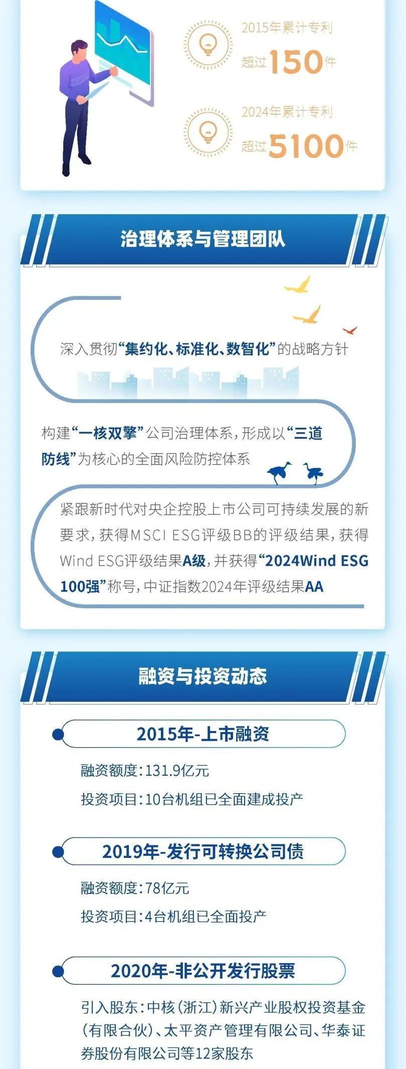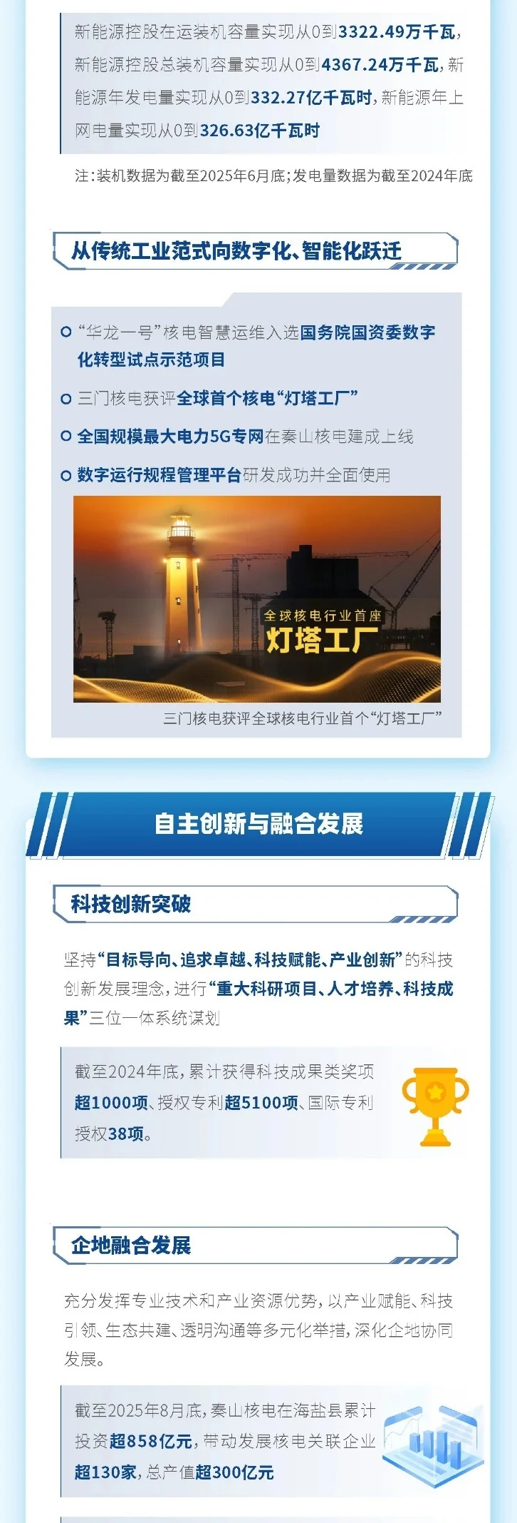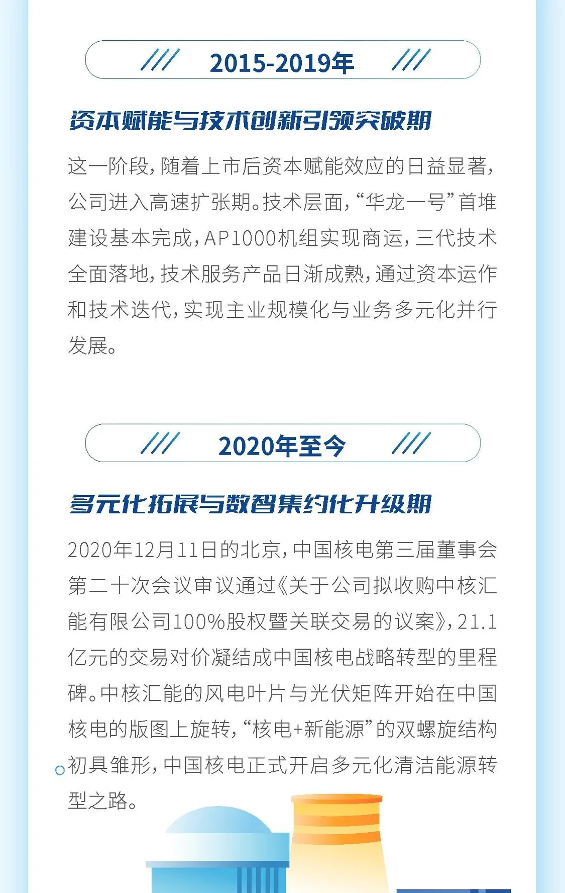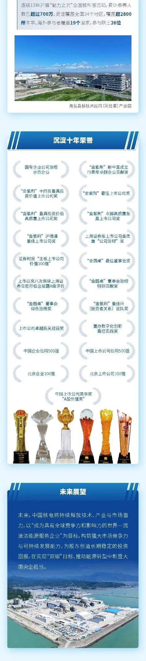 2015年6月10日,中国核电以代码“601985”铭刻核工业历史与初心、登陆A股市场以来,始终秉持“强核强国、造福人类”的企业使命,积极践行国家绿色低碳发展战略,实现了从单一核电运营向“核能+非核清洁能源+战略新兴产业”多元布局的战略转型,完成了从跟跑、并跑到局部领跑的历史性跨越。十年间,中国核电装机规模实现跨越式增长,在运、在建核电机组数量显著提升,非核清洁能源装机突破3000万千瓦。2024年,公司旗下25台运行机组全部达到“WANO卓越行动计划2030”绩效目标,成为全球首批全部运行机组达标的企业;三门核电获评全球核电行业首个“灯塔工厂”;“玲龙一号”小堆示范工程开工、全球首个将四代核电技术高温气冷堆与压水堆耦合的江苏徐圩核能供热发电厂项目获得核准、“和福一号”同位素产品打破垄断并实现全产业链供应等重大成果,彰显了中国核电在科技创新与产业应用方面的国际领先地位。