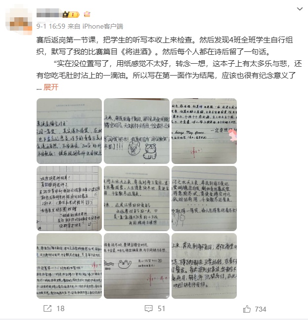 已毕业的学生发来暖心问候。图/受访者社交账号