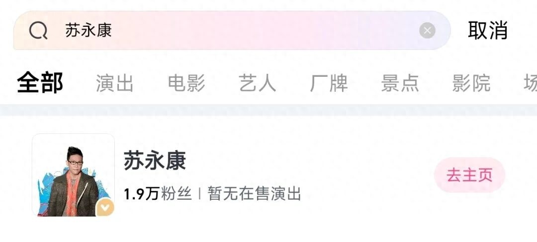 据新闻晨报,近日,“涉毒艺人苏永康将在温州举办演唱会”一事引发关注。9月16日,搜索大麦App发现,已无法查询到苏永康演唱会信息,在“艺人”一栏中可以看到,苏永康拥有1.9万粉丝,暂无在售演出。