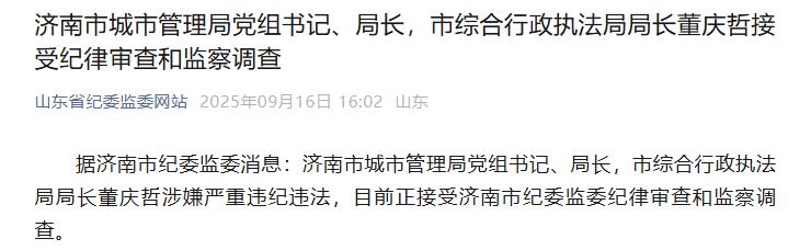 据济南市纪委监委消息:济南市城市管理局党组书记、局长,市综合行政执法局局长董庆哲涉嫌严重违纪违法,目前正接受济南市纪委监委纪律审查和监察调查。