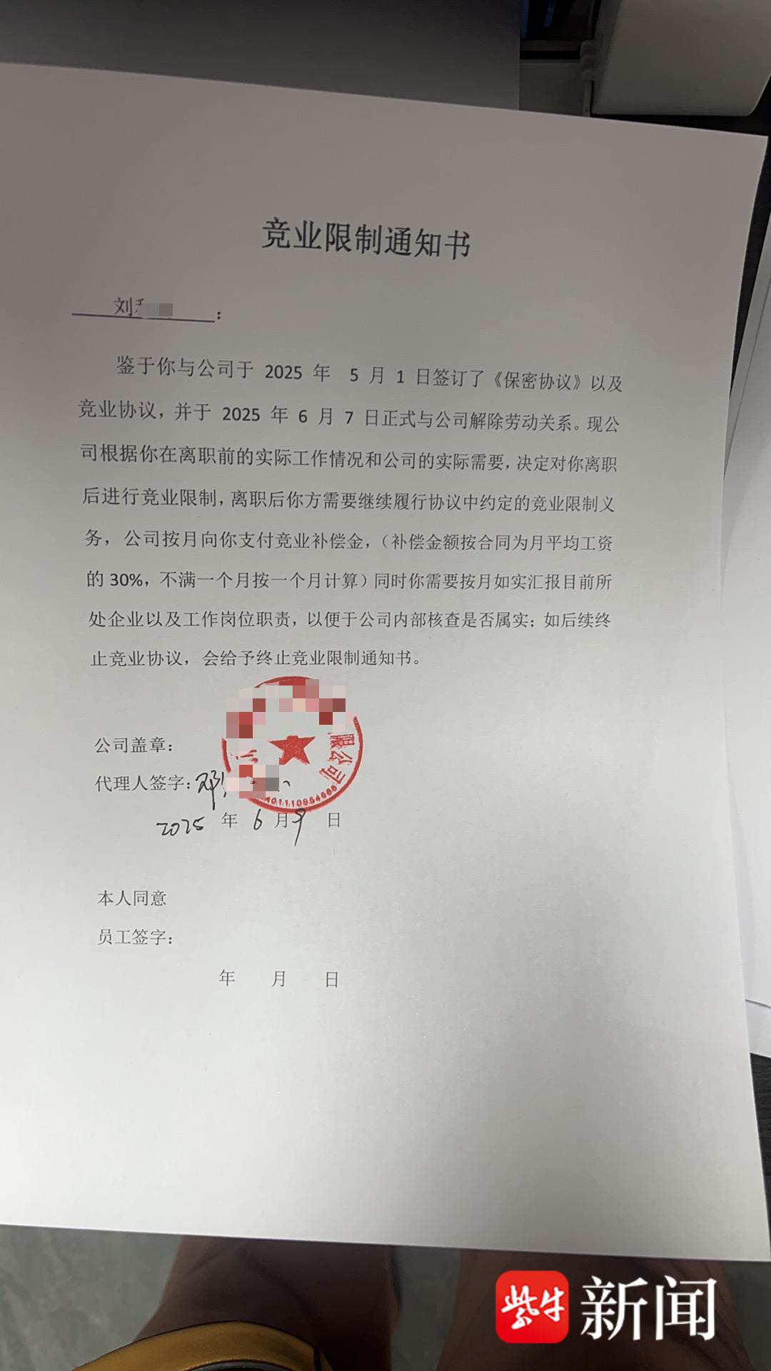 6月9日,刘女士办了离职手续,公司把竞业限制通知书盖章交给她,其中写明:现公司根据你在离职前的实际工作情况和公司的实际需要,决定对你离职后进行竞业限制,离职后你方需要继续履行协议中约定的竞业限制义务,公司按月向你支付竞业补偿金(补偿金额按合同为月平均工资的 30%,不满一个月按一个月计算),同时你需要按月如实汇报目前所处企业以及工作岗位职责,以便于公司内部核查是否属实:如后续终止竞业协议,会给予终止竞业限制通知书。”