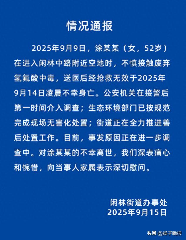 2025年9月9日,涂某某(女,52岁)在进入闲林中路附近空地时,不慎接触废弃氢氟酸中毒,送医后经抢救无效于2025年9月14日凌晨不幸身亡。