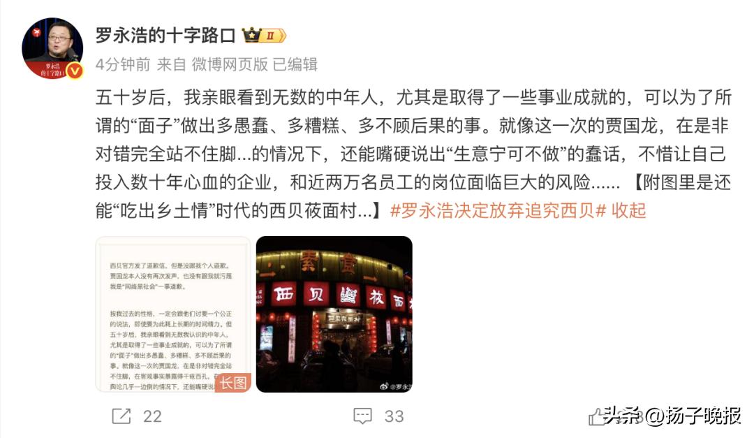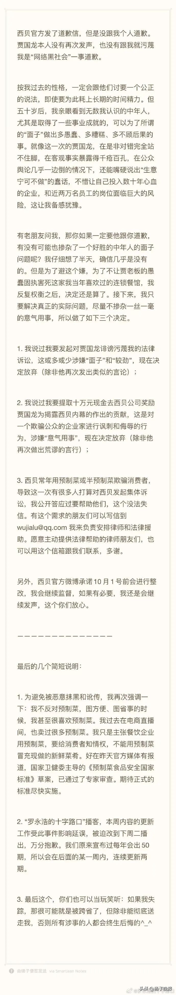 9月15日,罗永浩发文称,决定放弃进一步追究西贝。全文如下: