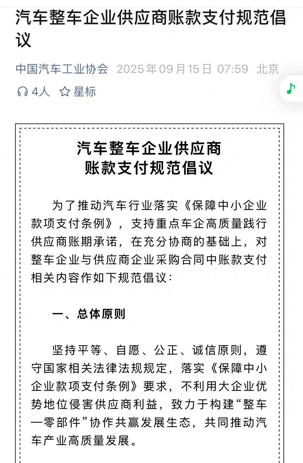 中汽协方面表示,这是为了推动汽车行业落实《保障中小企业款项支付条例》,支持重点车企高质量践行供应商账期承诺,在充分协商的基础上,对整车企业与供应商企业采购合同中账款支付相关内容作规范倡议;不利用大企业优势地位侵害供应商利益,致力于构建“整车—零部件”协作共赢发展生态,共同推动汽车产业高质量发展。