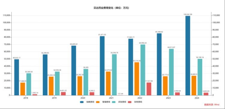 为维持收入增长,贝达药业正试图通过加强市场推广弥补动能不足,但代价却是持续侵蚀其曾经领先的研发投入。2025年上半年,公司销售费用达5.94亿元,同比增长13.34%;管理费用2.61亿元,同比上升23.47%;财务费用3953.05万元,同比激增118.06%。尽管“三费”大幅攀升,营业收入却未出现相匹配的增长。