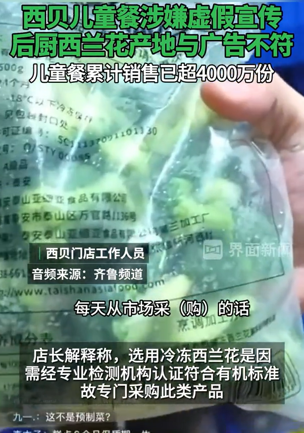 近日,西贝与罗永浩的“预制菜争议”持续引发关注,其间西贝儿童套餐也登上热搜。 直播中有媒体在西贝某门店后厨发现,儿童套餐中所使用的西兰花为保质期长达两年的冷冻产品;店长解释称,选用冷冻西兰花是因需经专业检测机构认证符合有机标准,故专门采购此类产品。 随后,有网友据此对比发现,西贝2023年视频广告中宣传的西兰花产地与媒体实地拍摄后厨所用产品的产地不一致,广告中标注产地为宁夏贺兰县,而实际后厨发现的包装显示来自山东泰安,进而质疑西贝虚假宣传。截至发稿,西贝尚未就此公开回应。