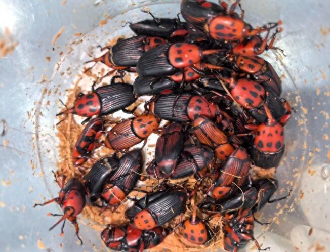 东兴海关关员在东兴口岸一桥对进境旅客及其行李物品进行监管时,发现一名旅客随身携带的背包机检图像异常。经进一步检查,关员在该背包内查获一个透明塑料罐,罐内有大量活体甲虫及饲养材料。这些甲虫共计36头,呈红棕色,头部向前延伸成明显的喙,经南宁海关技术中心鉴定,均为“红棕象甲”。
