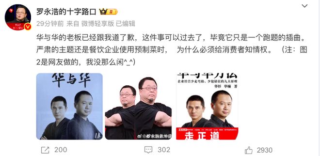 9月11日晚间,华杉发微博表示,“西贝是拼了老命要把菜做好的企业,贾国龙又是极其爱惜自己羽毛的人,罗永浩这样的污蔑,他绝对受不了。”