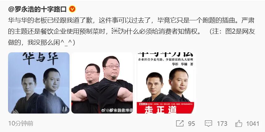 罗永浩今日微博发文称:华与华的老板已经跟我道了歉,这件事可以过去了,毕竟它只是一个跑题的插曲。严肃的主题还是餐饮企业使用预制菜时,为什么必须给消费者知情权。