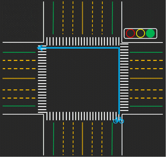 左转、直行同时放行时,此时非机动车直接左转容易与直行机动车发生冲突。因此,当前方绿灯亮时,可以直行到对面等候,待另一方向变成绿灯时,再安全通过,即二次过街。