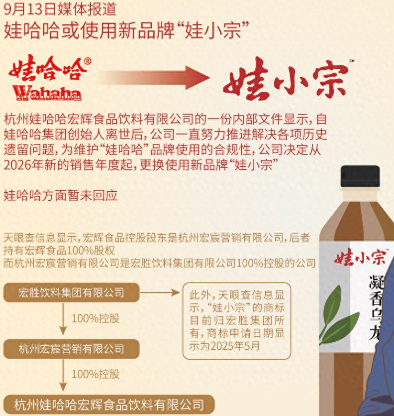 9月13日,一份据称是杭州娃哈哈宏辉食品饮料有限公司的内部文件《关于开展2026销售年度经销商沟通工作的通知》在网络上流传。文件中明确提到,“自娃哈哈集团创始人离世后,公司一直努力推进解决各项历史相关遗留问题”。为确保品牌使用的合规性,该公司决定从2026销售年度起,更换使用新品牌“娃小宗”。文件的核心解释在于,在现行股权架构下,“娃哈哈”商标的使用,必须获得娃哈哈集团全体股东的一致同意,任何一方均无权单独使用。因此,公司将持续与相关股东就“娃哈哈”商标使用事宜保持积极沟通。