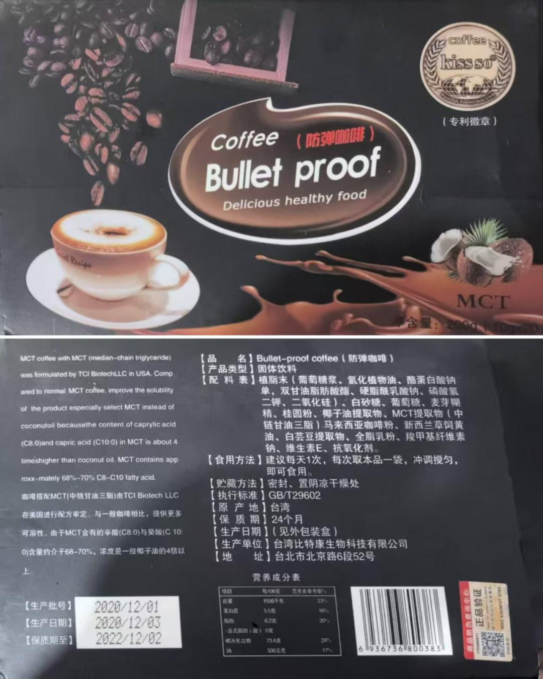 许倩的丈夫杨致远告诉新京报记者,2020年年底,许倩想要减肥,网购了“纤so坊”防弹咖啡,这款咖啡按盒销售,一盒20包,包装显示生产单位是位于中国台湾的一家公司。