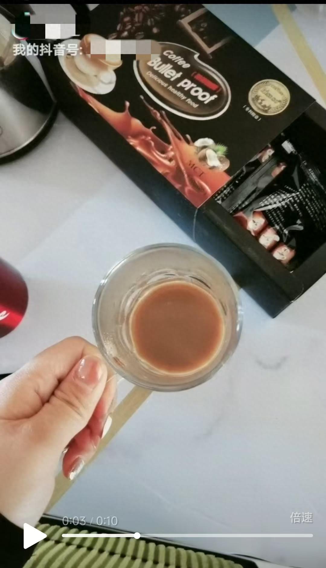 为了宣传这款咖啡的减肥功效,被带走之前的一年时间里,几乎每天早上,许倩都会举起手机,拍下她用温水化开一包咖啡粉,然后一饮而尽的画面。视频发到朋友圈“打卡”,并附上每日体重。
