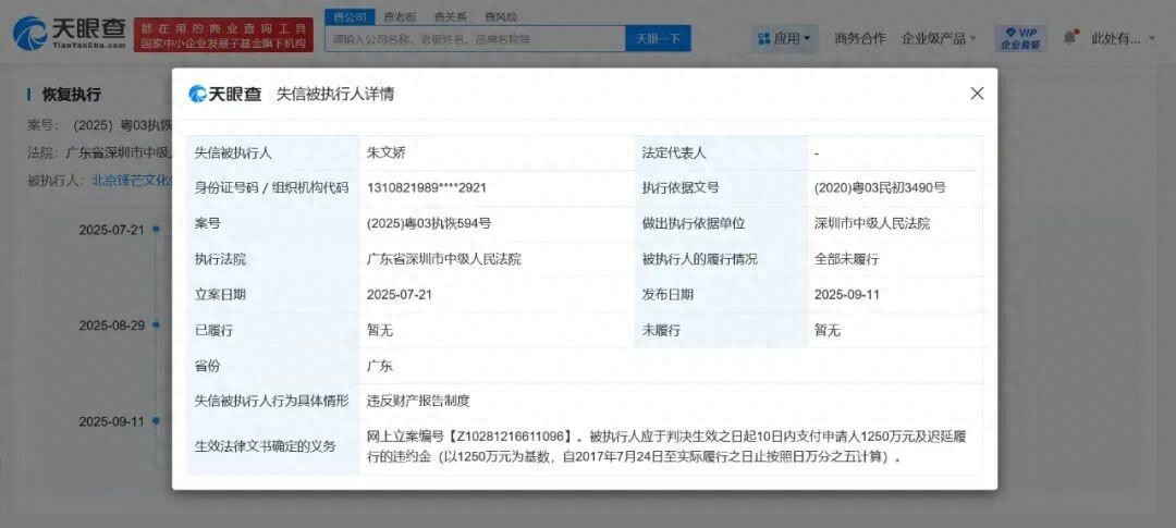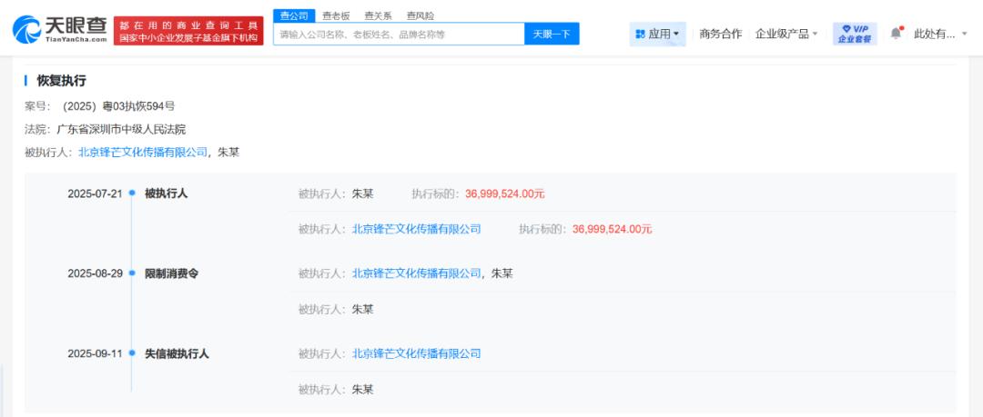 天眼查App显示,近日,朱文娇(柴鸡蛋)及名下北京锋芒文化传播有限公司因违反财产报告制度,被广东省深圳市中级人民法院列为失信被执行人(老赖),履行情况为全部未履行。案件流程信息显示,今年7月,朱文娇及公司已因此案被恢复执行3699万余元,此后被限制高消费。