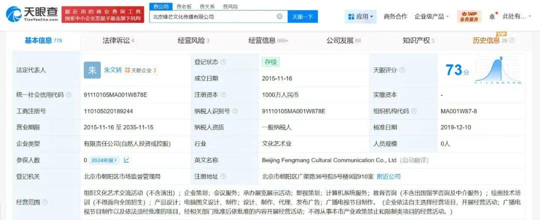 北京锋芒文化传播有限公司成立于2015年11月,法定代表人为朱文娇,注册资本1000万人民币,经营范围含组织文化艺术交流活动、企业策划、会议服务、承办展览展示活动等。股东信息显示,该公司由朱文娇、北京光线影业有限公司共同持股。