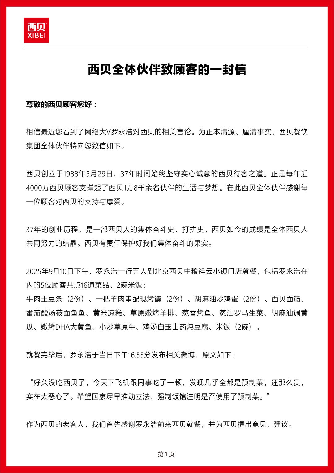 9月12日15时03分,西贝在官方微信发布《西贝全体伙伴致顾客的一封信》,这是公司在风波爆发两天后的首次系统回应。信中逐条还原罗永浩所点的13道菜的工艺流程,附上“作业指导书”。