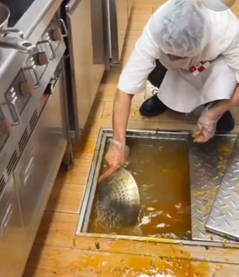 9月14日,极目新闻记者注意到,一段视频中,员工用不锈钢漏勺疏通下水道,漏勺上没有明确的用途标识。另一段视频显示,下水道一旁的操作台上,锅里放着一个不锈钢漏勺,与疏通下水道的漏勺相似。