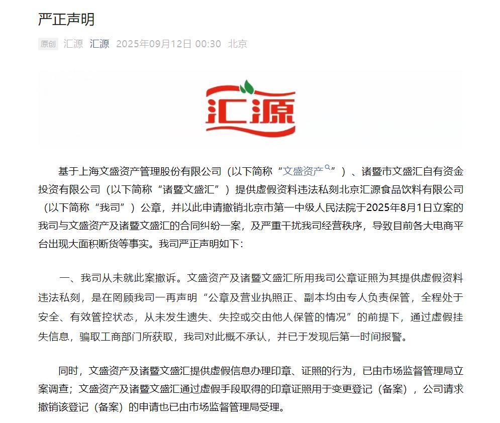 声明中指出,上海文盛资产管理股份有限公司(简称“文盛资产”)、诸暨市文盛汇通过提供虚假资料违法私刻汇源果汁公章,并以此申请撤销北京市第一中级人民法院于2025年8月1日立案的汇源果汁与文盛资产及诸暨文盛汇的合同纠纷一案,以及严重干扰公司经营秩序,导致目前各大电商平台出现大面积断货。