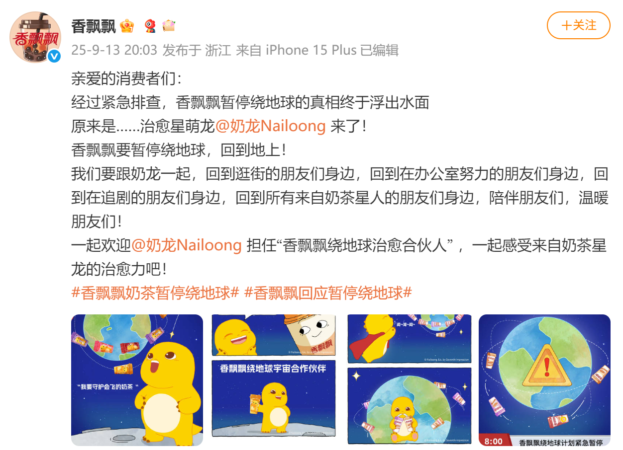 经过紧急排查,香飘飘暂停绕地球的真相终于浮出水面,原来是……治愈星萌龙@奶龙Nailoong 来了!香飘飘要暂停绕地球,回到地上!香飘飘称奶龙将担任“香飘飘绕地球治愈合伙人” 。